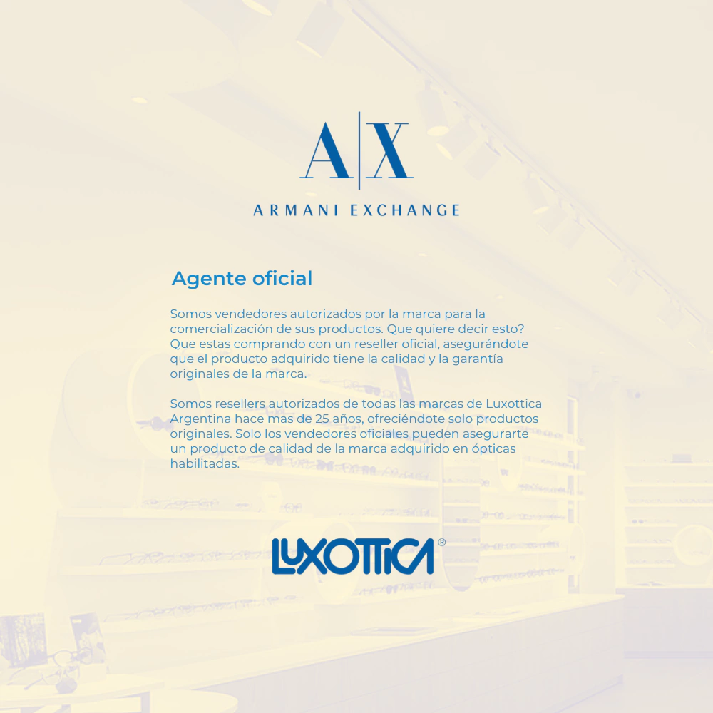 La lìnea de moda joven de Armani nos trae una colecciòn atemporal, deportiva y elegante con detalles propios de una de las insignias de la moda italiana. Sus colores y formas expresan la imagen moderna unisex como objetivo principal tendencia. Fabricados por Luxottica, el principal productor de anteojos de marcas de lujo a nivel mundial nos asegura una excelente prestaciòn no solo en su acabado sino tambien en su uso.